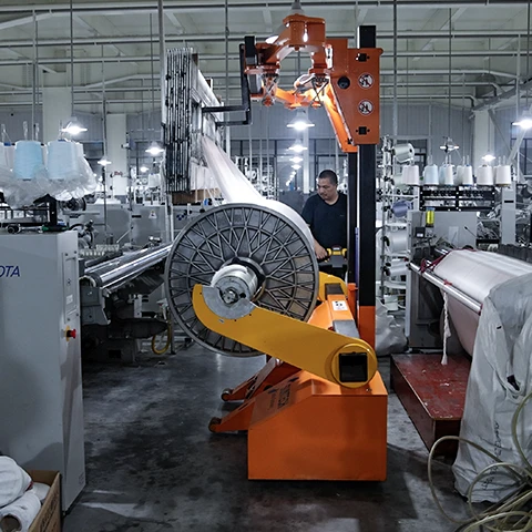 A range of automated and electric systems for lifting, transporting, and storing warp beams, improving workflow efficiency and operational safety in textile mills.